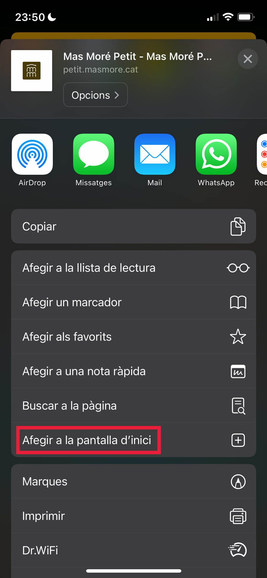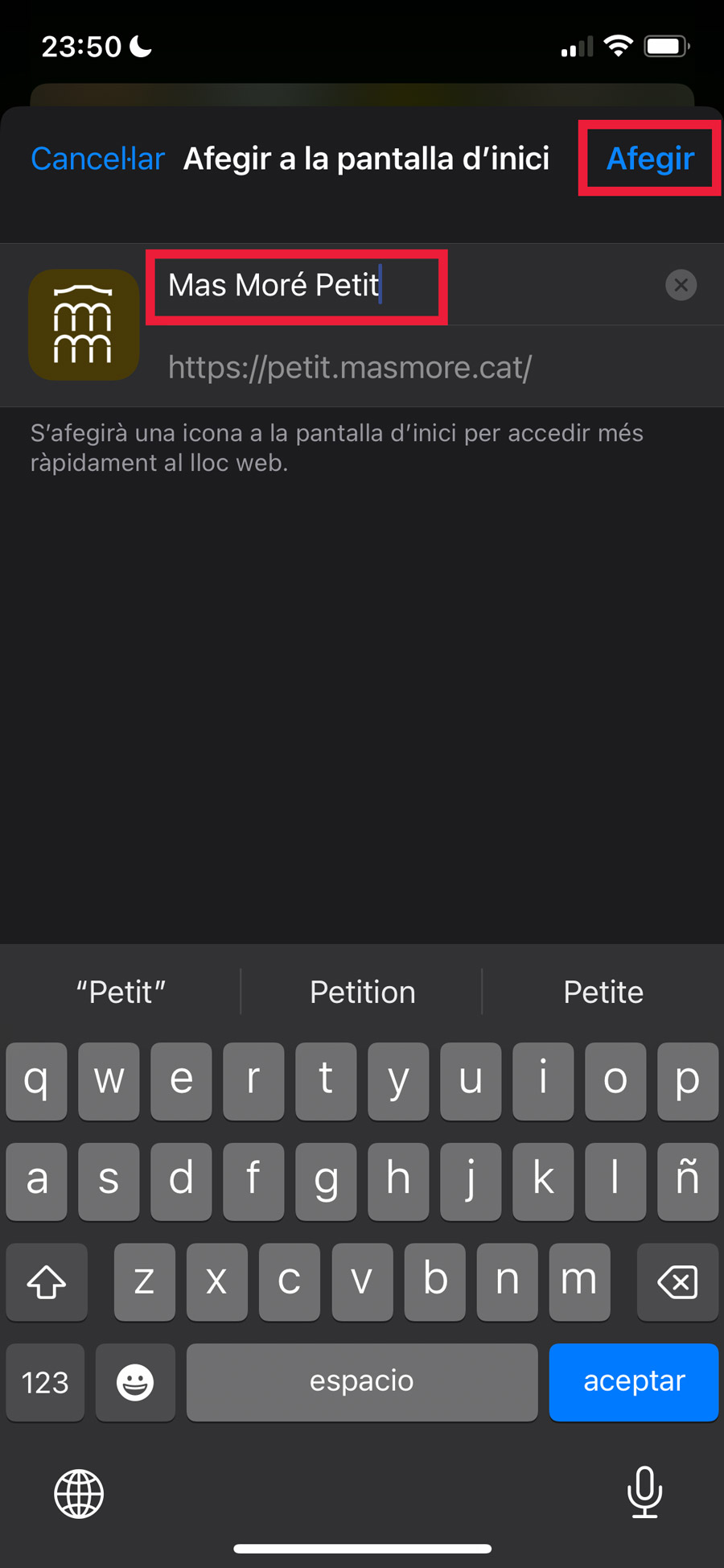 Type the name you want to appear under the icon. You can leave what appears by default “Mas Moré Petit”.